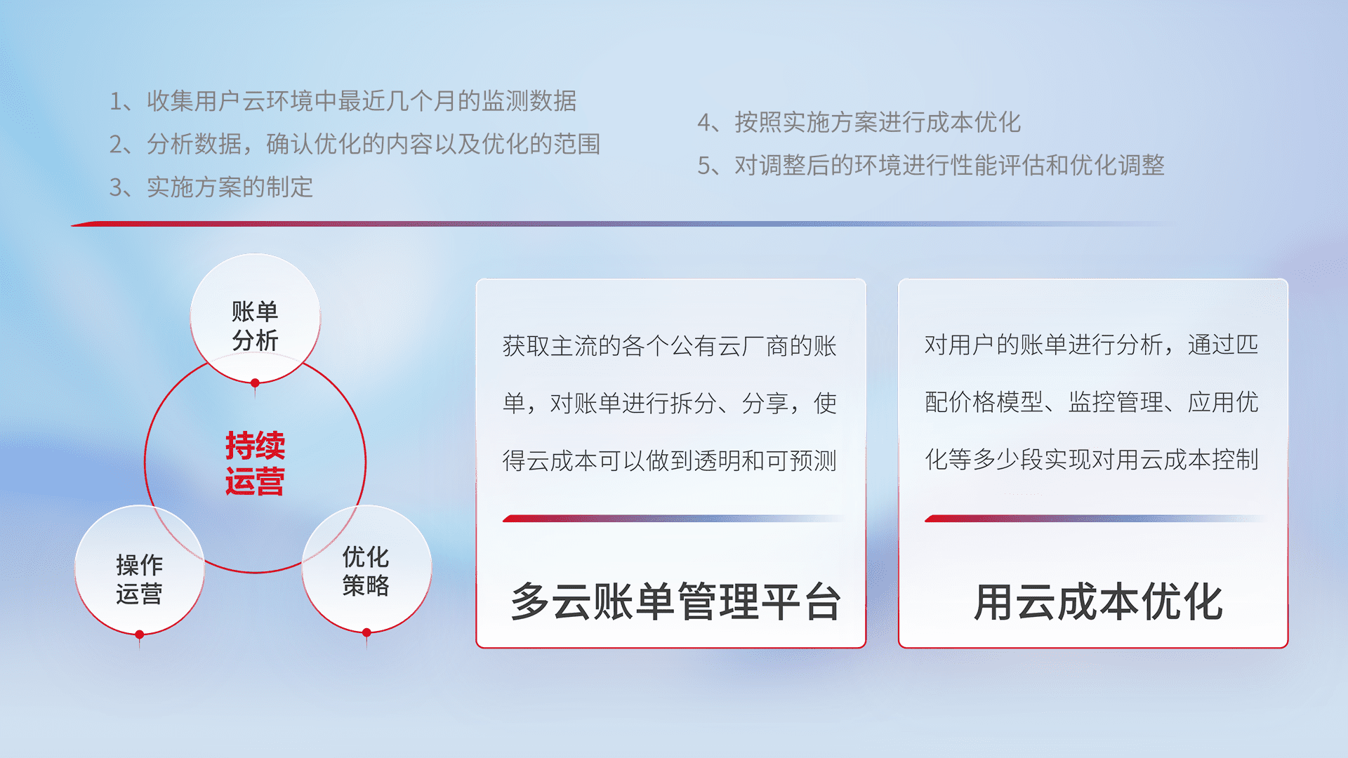 通过多云纳管,,以统一的资源数据模型把客户的云资源进行抽象和封装,,,,进而实现对多云资源的统一操作,,保障云资源管理的可靠性、、稳定性与可用性。。量身定制化运维内容,,,,配置、、开发运维、、、、补丁管理、、、、备份、、、监控、、认证和访问管理、、审计和日常巡检等,,保障在用云过程中的可靠度,,,,稳定度以及高可用率。。